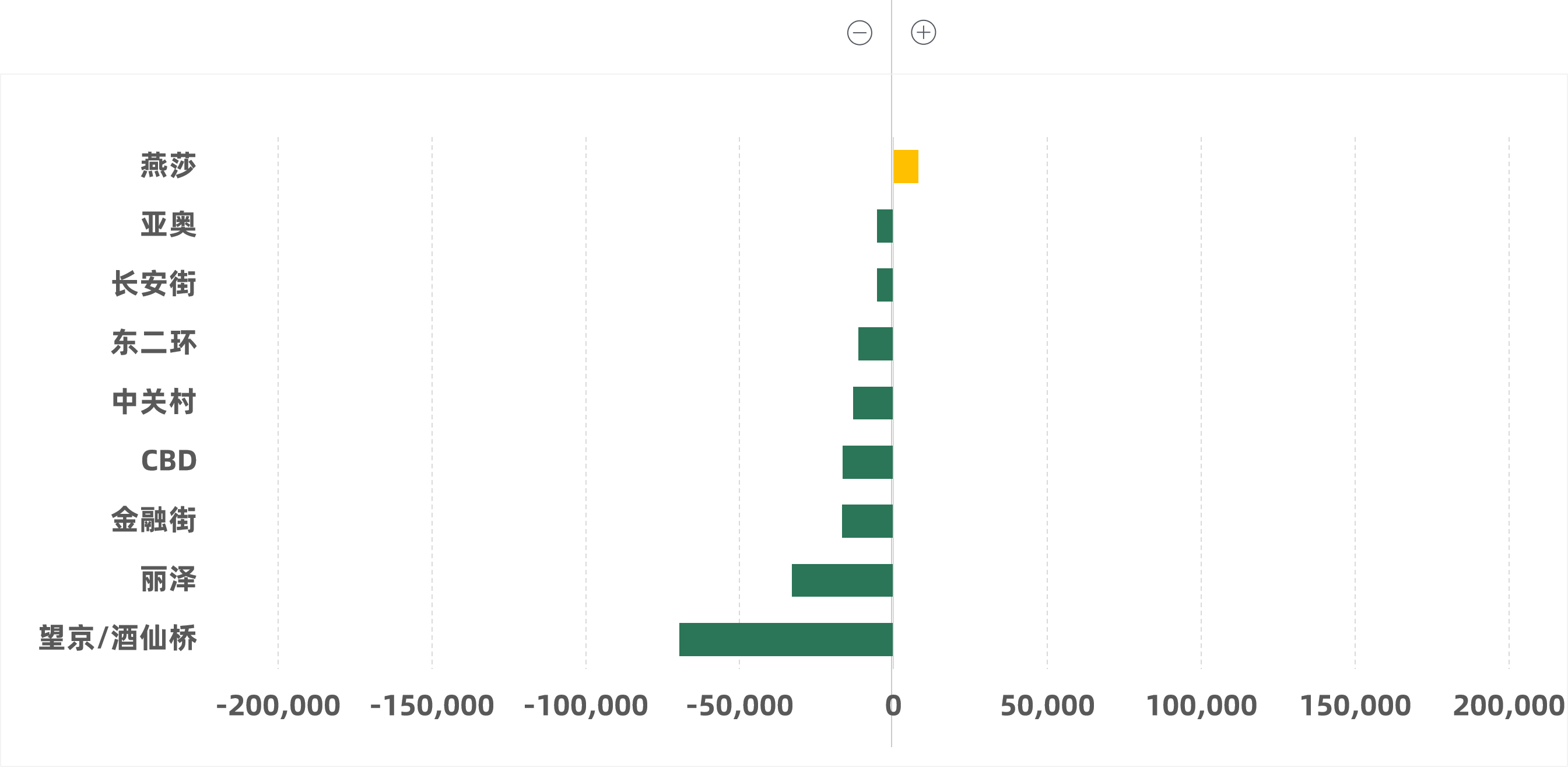 從各商圈成交面積來看,燕莎商圈本季度表現(xiàn)上升,成交面積環(huán)比上季度漲幅接近1萬 平方米;其余各主要商圈的成交面積環(huán)比均有降低,麗澤和望京/酒仙橋商圈成交面積環(huán)比降幅約為3萬平方米和7萬 平方米。