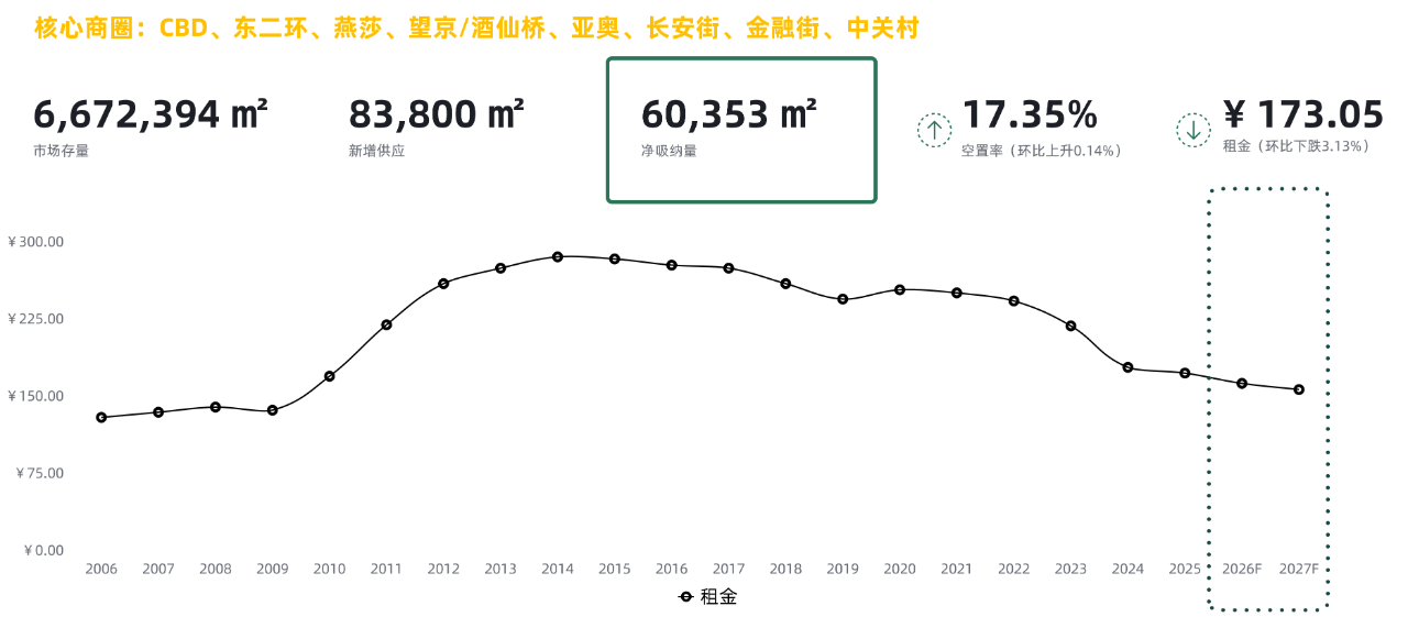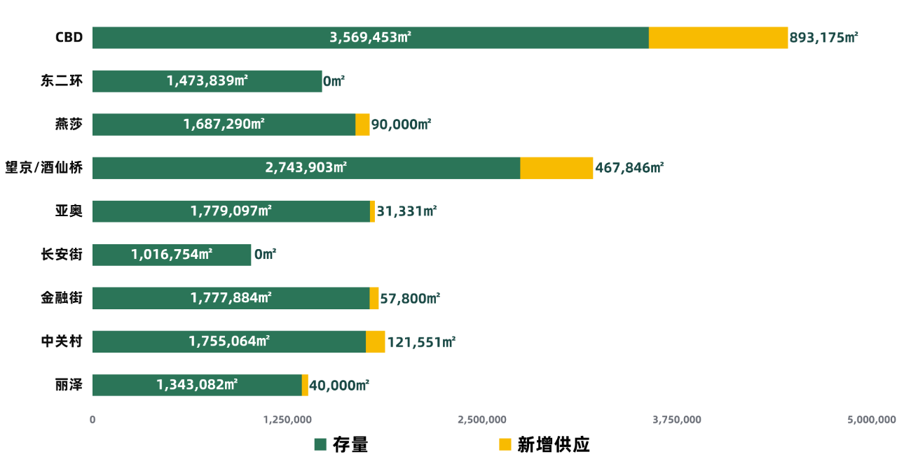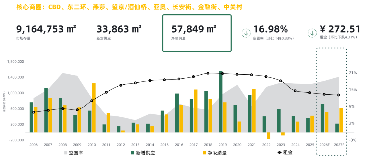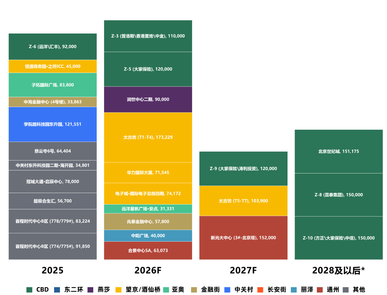 2025年全年投入市場的 新增供應(yīng)量 預(yù)計將超過78萬平方米,其中核心商圈約37萬平方米,甲級寫字樓占比超過五成,持續(xù)豐富企業(yè)的選擇。在2026-2028年期間,全市主要商圈新增供應(yīng)量將主要集中在CBD、望京/酒仙橋及亞奧商圈;并在未來,金融街、燕莎、麗澤商圈也將有新的寫字樓項目相繼入市。
