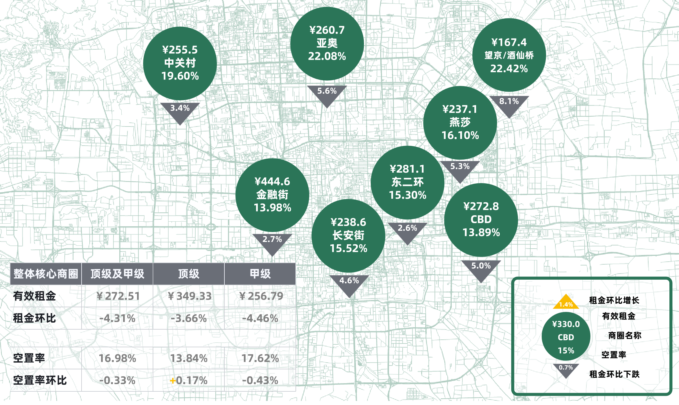 2025年第一季度成交租金延續(xù)下行,全市寫字樓平均成交租金由每月每平方米204元降低至195元;本季度有多個新增項目入市,主要集中于非核心商圈;全市空置率受新項目入市及部分樓宇釋放空置影響小幅上升,核心商圈甲級(含頂級)寫字樓空置率小幅降低;凈吸納量層面,相較上季度有所降低,但整體表現(xiàn)依然積極。