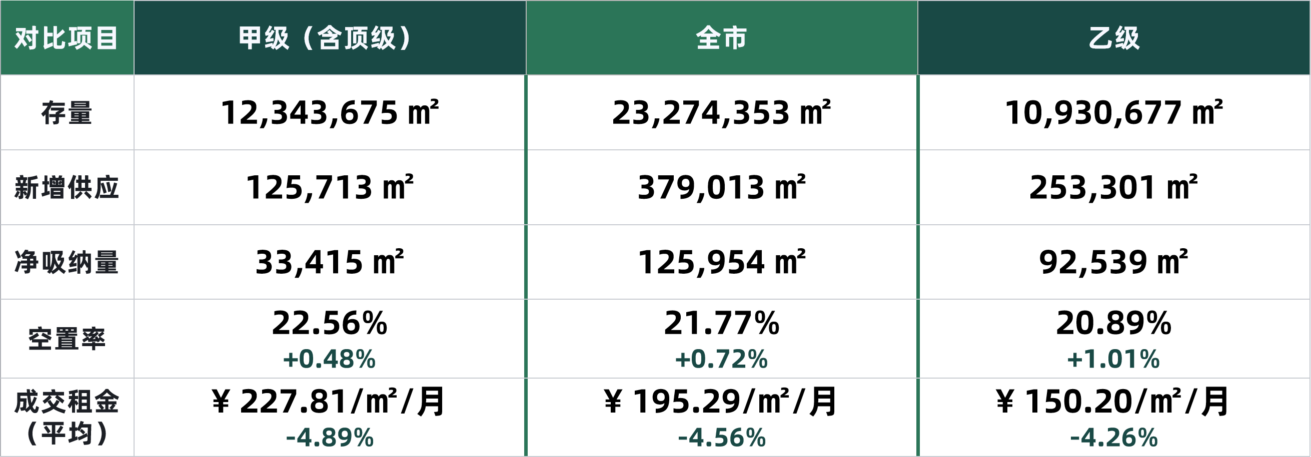 本季度多個項目集中入市,為市場帶來大量新增供應(yīng),預(yù)計2025年全年還將持續(xù)有項目交付。全市整體寫字樓凈吸納量環(huán)比上升12.5萬平方米,其中甲級(含頂級)寫字樓凈吸納量為33,415平方米,環(huán)比下降14.2萬平方米。